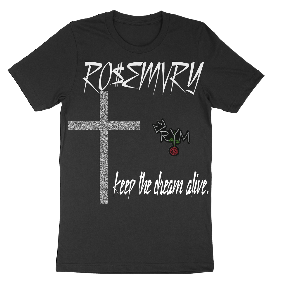 Keep the dream alive. RYM patch. Silver cross. Black t-shirt.
